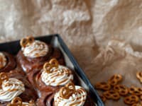 Остальные шоколадная стружка поместите в среднюю миску. Кипятите взбитые сливки, пока они не прогреются, в общей сложности около 1 минуты. Вылейте горячие взбитые сливки на шоколадную стружку и оставьте на 30 секунд. Затем взбивайте до образования гладкой смеси. Приготовленный таким образом ганаш намазываем на шоколадные рулеты с корицей. Посыпьте орехами пекан.