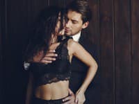 Элегантный мужчина в черном костюме. Пара дома. Горячая женщина в черном нижнем белье (Источник: Getty Images/prostooleh)